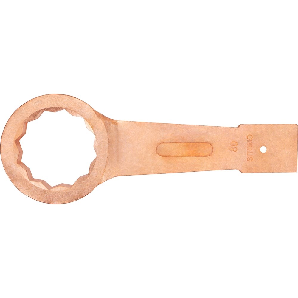 Двусторонний накидной ударный ключ предназначен для работ с резьбовыми соединениями в процессе ремонтных и монтажных работ. Инструмент выполнен из высококачественной стали, благодаря чему отличается прочностью и долговечностью. Омедненное покрытие обладает повышенной устойчивостью к высокотемпературному воздействию случайной искры. Ключ может применяться на предприятиях с наличием потенциально опасных сред, а также в быту. Одна из рабочих поверхностей ключа предназначена для ударных воздействий с целью увеличения усилия при работе с тугими крепежными соединениями.