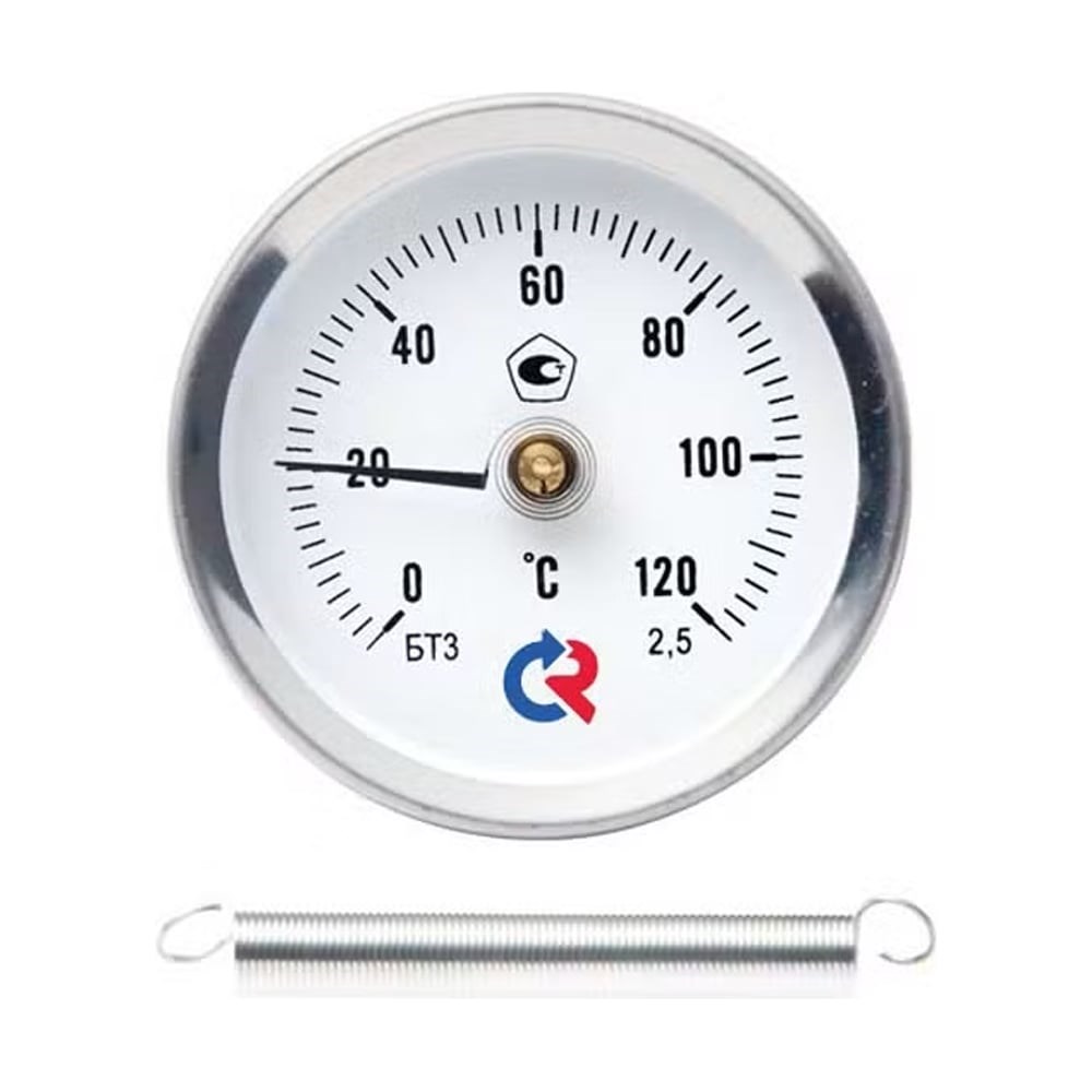 Термометр накладной с пружиной РОСМА БТ-30.010 предназначен для измерения температуры приповерхностного слоя среды (вязкой, жидкой, газообразной) цилиндрических объектов, например трубы в системе отопления. Принцип действия прибора основан на зависимости деформации чувствительного элемента от измеряемой температуры. В качестве чувствительного элемента используется биметаллическая пружина, которая изготавливается из двух прочно соединенных металлических пластин, имеющих различные температурные коэффициенты линейного расширения. При изменении температуры пружина, которая навита вокруг оси контактного элемента, изгибается и вращает стрелку термометра, при этом стрелка закреплена непосредственно на биметалле. Область применения: накладные термометры используются в системах отопления, кондиционирования, теплоснабжения. Температура окружающей среды: −10°C…+60°C Межповерочный интервал: 3 года Корпус: IP43, коррозионностойкая сталь 12Х15Г9НД Кольцо: коррозионностойкая сталь 12Х15Г9НД, запрессованное Чувствительный элемент: биметаллическая спираль Присоединение: стальная спиральная пружина для крепления на трубе диаметром от 20 до 50 мм Межповерочный интервал: 3 года Климатическое исполнение: группа C2 по ГОСТ Р 52931; климатическое исполнение УХЛ категории 2.1 по ГОСТ 15150 Товар может отличаться от представленного на фото, при выборе ориентируйтесь на технические характеристики.