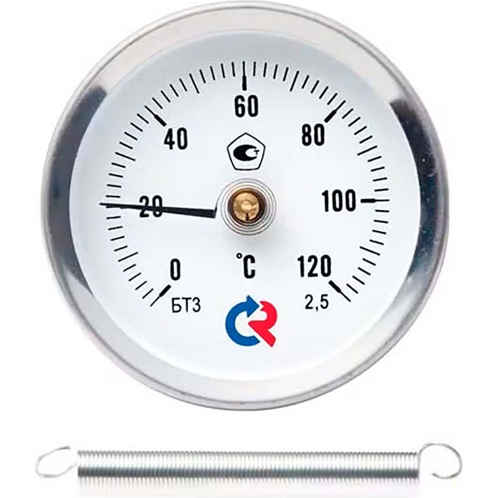 Термометр биметаллический РОСМА БТ-010 накладной с пружиной предназначен для измерения температуры приповерхностного слоя среды (вязкой, жидкой, газообразной) цилиндрических объектов, например трубы в системе отопления. Принцип действия прибора основан на зависимости деформации чувствительного элемента от измеряемой температуры. В качестве чувствительного элемента используется биметаллическая пружина, которая изготавливается из двух прочно соединенных металлических пластин, имеющих различные температурные коэффициенты линейного расширения. При изменении температуры пружина, которая навита вокруг оси контактного элемента, изгибается и вращает стрелку термометра, при этом стрелка закреплена непосредственно на биметалле. Корпус прибора изготовлен из коррозионностойкой стали. Область применения: накладные термометры используются в системах отопления, кондиционирования, теплоснабжения. Основные характеристики: Чувствительный элемент: биметаллическая спираль Корпус: IP43, коррозионностойкая сталь 12Х15Г9НД Кольцо: коррозионностойкая сталь 12Х15Г9НД, запрессованное Циферблат: алюминий, шкала черная на белом фоне Стекло: минеральное Присоединение: стальная спиральная пружина для крепления на трубе диаметром от 20 до 50 мм Межповерочный интервал: 3 года Климатическое исполнение: группа C2 по ГОСТ Р 52931; климатическое исполнение УХЛ категории 2.1 по ГОСТ 15150 Товар может отличаться от представленного на фото, при выборе ориентируйтесь на технические характеристики.
