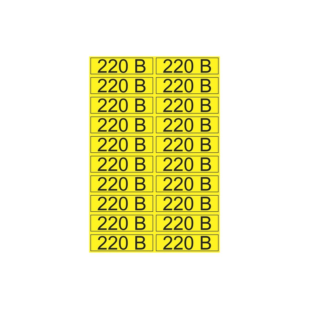 Наклейка знак электробезопасности 220В 15x50 мм - это информационный знак, который размещается для информирования о напряжении в электрической сети, около розеток и выключателей. Такие наклейки предназначены для предупреждения и информирования окружающих, а также для организации мест работы электромонтажных бригад, несут дополнительную информационную нагрузку.Знак хорошо виден и сохраняет яркость цветов долгое время даже при постоянном использовании. Имеет хорошую устойчивость к смазыванию, стойкость к прямым солнечным лучам, перепадам температуры, мелким механическим воздействиям. Выполнен из прочного, износостойкого материала, легко клеится, крепко держится и не оставляет следов после снятия.Комплект набора: 100 наклеек размером 15 (вертикаль) х 50 (горизонталь) мм (5 листов по 20 наклеек на каждом).