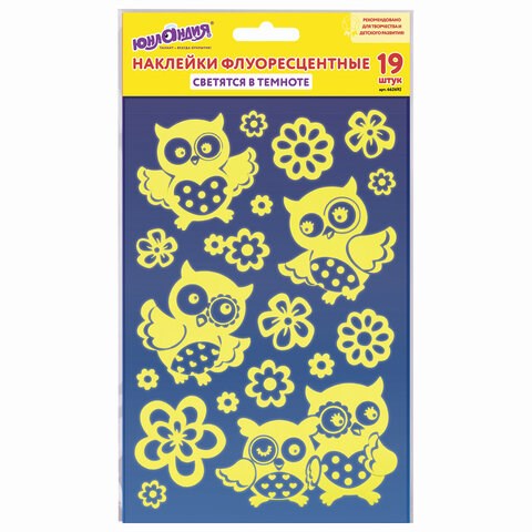 Наклейки флуоресцентные "Совы", светятся в темноте, 19 штук, ассорти, 14х21 см, ЮНЛАНДИЯ, 662692