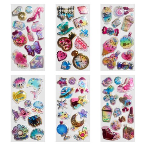 Высокое качество печати гарантирует, что наклейки долго остаются яркими и радуют глаз. А пересыпающиеся блестки внутри наклеек обязательно вызовут восторг у маленьких принцесс!