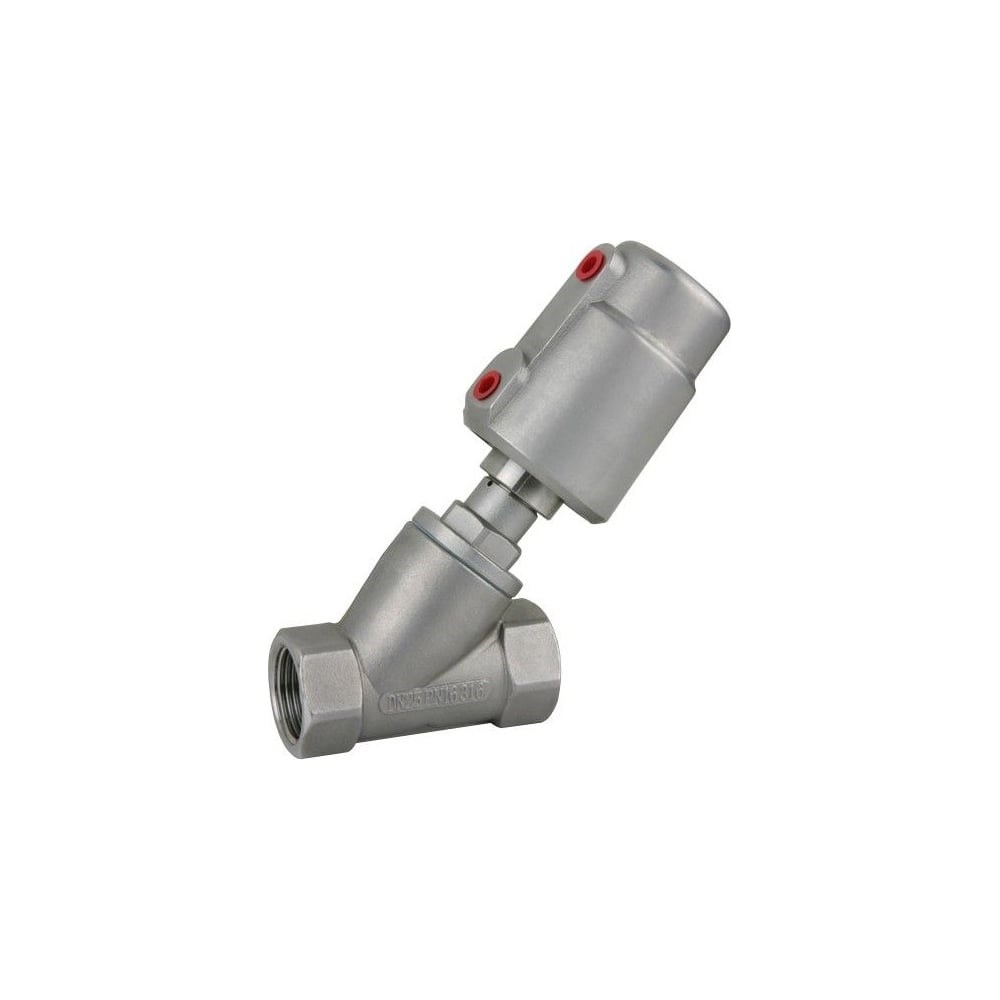 Седельный наклонный клапан с пневмоприводом из нержавеющей стали применяется для регулирования потока жидкостей и газов, в пищевой и химической промышленности, системах водоподготовки, производстве напитков, в процессах с использованием пара, станциях водоочистки, оборудовании стерильной упаковки и многих других областях. Благодаря высокой пропускной способности могут применяться на линиях транспортирующих вязкие среды. Состоит из корпуса из нержавеющей стали AISI 304, рабочего штока, седла, обеспечивающего герметичность клапана и пневмопривода из нержавеющей стали, который приводит в действие шток. Клапан в стандартном исполнении является нормально закрытым. Имеет тип присоединения с внутренней резьбой.
