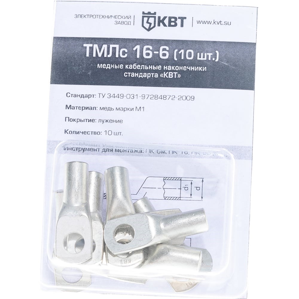 Предназначены для оконцевания опрессовкой медных кабелей и проводов сечением 16 мм² под крепежный болт М6 Материал: рафинированная медь марки М1 Рабочее напряжение: до 1 кВ Покрытие: олово-висмутовое лужение (климатическое исполнение «Т2») Геометрия наконечников стандарта «КВТ» максимально приближена к размерам «стандартных» медных наконечников от европейских производителей Диаметр трубной части наконечников ТМЛс рассчитан под опрессовку жил 1, 2 и 3 классов гибкости, составляющих более 99% всех используемых строительных кабелей. Размеры и длина хвостовика наконечников стандарта «КВТ» обеспечивают точное позиционирование для опрессовки Маркировка типоразмера и логотипа производителя на каждом наконечнике