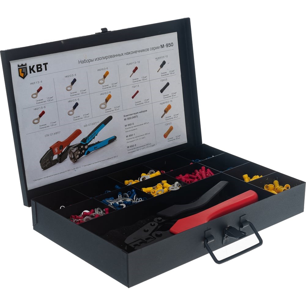 Набор изолированных наконечников КВТ М-950-1 75488 комплект состоит из гильз, изолированных наконечников и пресс-клещей для опрессовки медных многожильных проводов. Подходит для проводов различного диаметра Набор комплектуется наконечниками и гильзами самых распространенных размеров. Удобно определять провода по цвету Так как гильзы и наконечники имеют разные цвета, их можно использовать для маркировки проводов. Удобное хранение Металлический кейс отличается 12 отделениями, чтобы изделия набора не перемешивались.