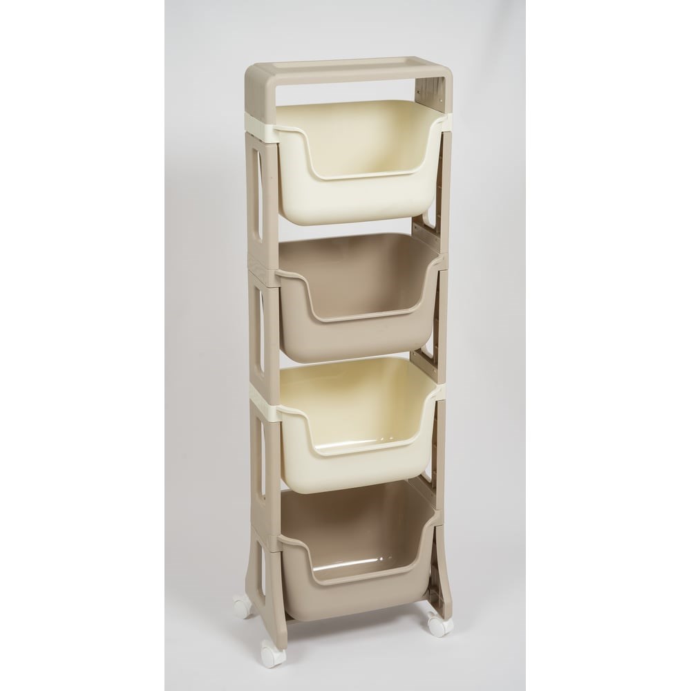 Этажерка Violet Junior напольная, 4-х ярусная, на колесах, латте/слоновая кость 771420 – универсальное решение для компактного хранения в доме, офисе или на даче. Стойка и ящики этажерки производятся без острых углов и соединений. Мягкие округлые формы делают органайзер идеальным для использования в детской комнате. Изделие удобно как для хранения игрушек, книг и канцелярии в детской, так и для хранения кухонной утвари, овощей и фруктов на кухне. Выполнена из пластика, не содержащего бисфенол А. Абсолютно безопасна для здоровья, поэтому может использоваться в любом уголке Вашего дома. Преимущество этажерки в ее легкости, устойчивости к влаге и простоте в уходе. Удобная система хранения – полки вместят большой объем предметов. Сверху этажерки имеется дополнительная многофункциональная полка. Благодаря колесам стойку можно перемещать без особых усилий, а тормоза на колесиках надежно фиксируют положение этажерки. Изделие поставляется в разобранном виде в индивидуальной коробке.