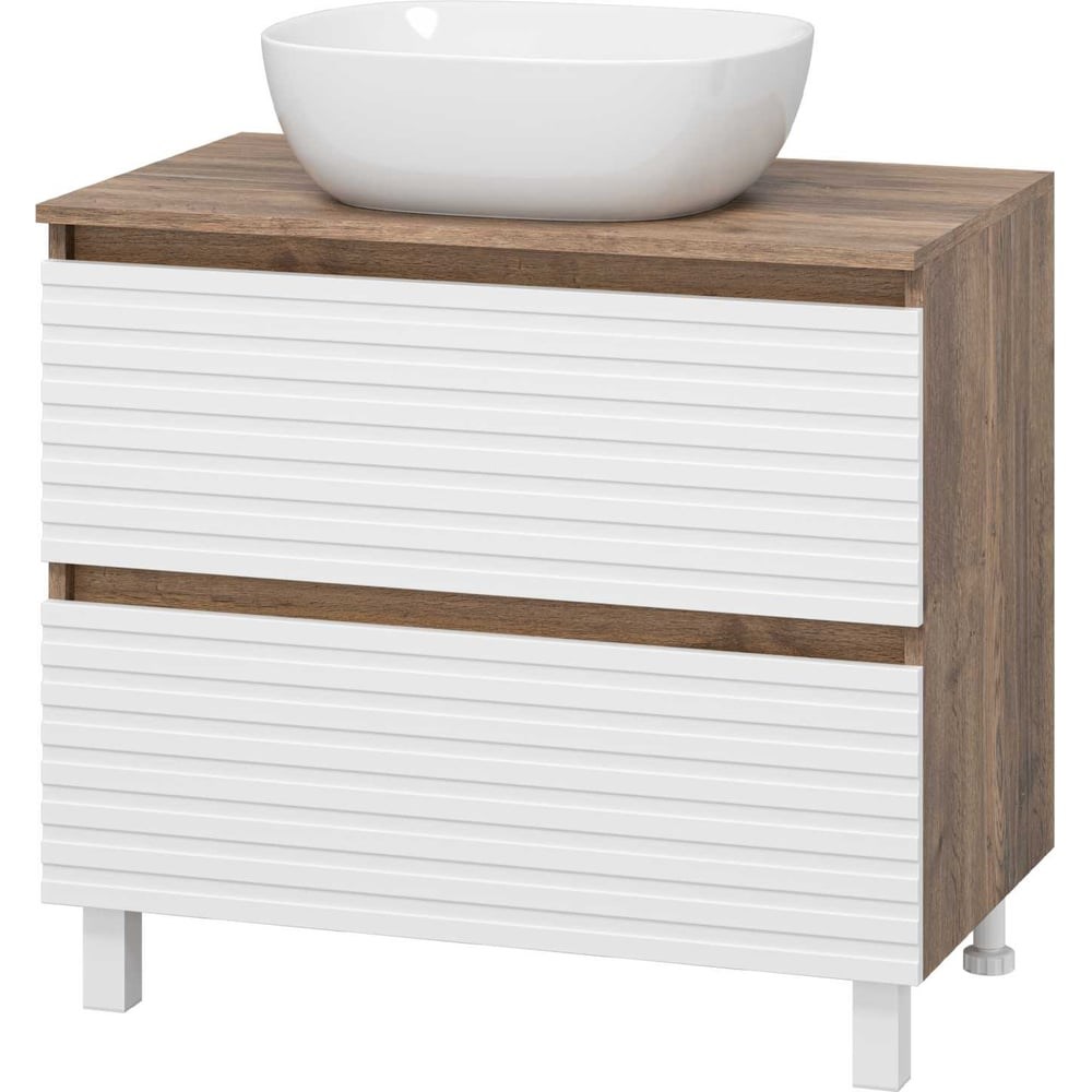 Внимание! Раковина не входит в комплект поставки. DAKOTA – комплект мебели в ванную комнату от бренда Brevita. В качестве основной цветовой гаммы было выбрано сочетание древесной текстуры (Дуб Галифакс олово) с белыми фасадами. Такая композиция находится в тренде последние несколько сезонов. Лаконичный и одновременно выразительный внешний вид позволит использовать мебель для ванной в интерьерах в стиле лофт, хай-тек или минимализм. Вне зависимости от типа установки, тумбы поставляются с цельной столешницей без отверстий, что позволяет выбрать удобное расположение накладной раковины.