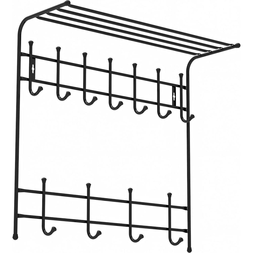 Настенная вешалка с полкой Nika 11 крючков, черная ВПТ11ч дополнит интерьер прихожей. Выполнена из стали с порошковым покрытием, устойчива к коррозии и механическим повреждениям. Оснащена специальной полкой для головных уборов.