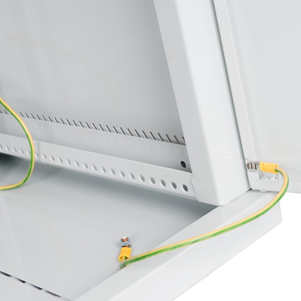 Настенный разборный шкаф 19" КДДС 9U, стеклянная дверь, 600x600, серый УТ000003575 предназначен для размещения активного и пассивного телекоммуникационного оборудования и удобен для организации сетей требующих частого обслуживания, перекоммутации и добавления активного и пассивного оборудования. Для фиксации на вертикальной поверхности(стена) в задней стенке шкафа предусмотрены 4 вертикальных паза шириной 8мм с круговым центральным расширением под диаметр 14мм. Дверь шкафа имеет возможность как левой, так и правой навески. Ввод кабеля осуществляется через основание шкафа или через крышу. Имеются посадочные места в крыше под установку вентиляторного блока. Боковые стороны шкафа, а также задняя стенка являются съемными, доступ для установки и коммутации оборудования возможен с трёх сторон. Для установки оборудования стандарта 19", шкафы оснащаются одной парой монтажных направляющих. Глубину установки оборудования на монтажных направляющих внутри шкафа можно изменять благодаря отверстиям на боковой раме с шагом 12,5мм. Максимальная допустимая распределенная нагрузка на шкаф составляет до 35 кг.