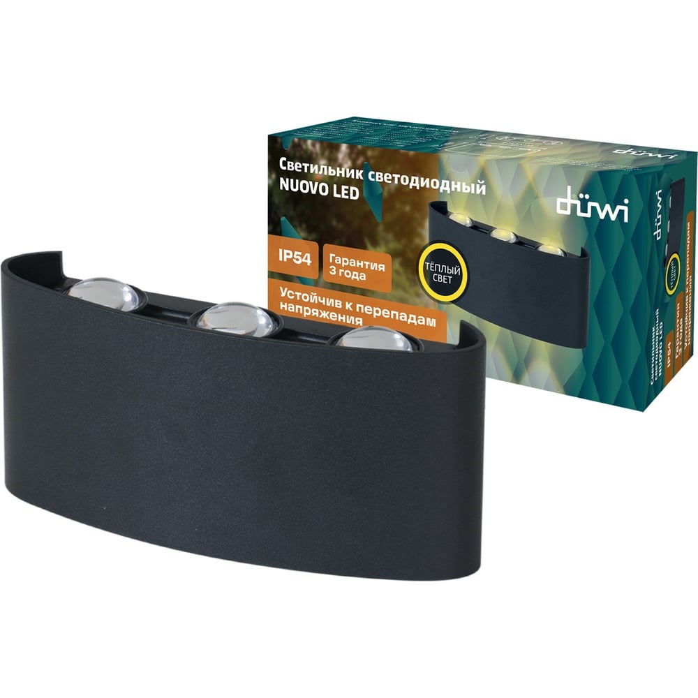 Настенный накладной светильник duwi NUOVO LED 6Вт ABS пластик 3000К IP54 черный 6 лучей 24771 9 предназначен для освещения архитектурных форм, зданий и придомовых территорий. Уровень защиты IP54 позволяет использовать его в любых погодных условиях: как уличный светильник, подсвечивая внешние стены и проходы, как дополнительный светильник бра внутри дома или квартиры, создавая особую атмосферу и стиль интерьера. Диапазон рабочих температур светильника от -25 до + 45°C. Материал корпуса светильника выполнен из термостойкого ударопрочного ABS-пластика. В накладном настенном светильнике NUOVO LED применена технология LED - в качестве ламп используются встроенные светодиодные элементы. Светодиодный настенный светильник с данными характеристиками рекомендуется использовать на даче, в саду, в коттедже, частном доме, для освещения гостевых домов и гостиниц, для подсветки террас.