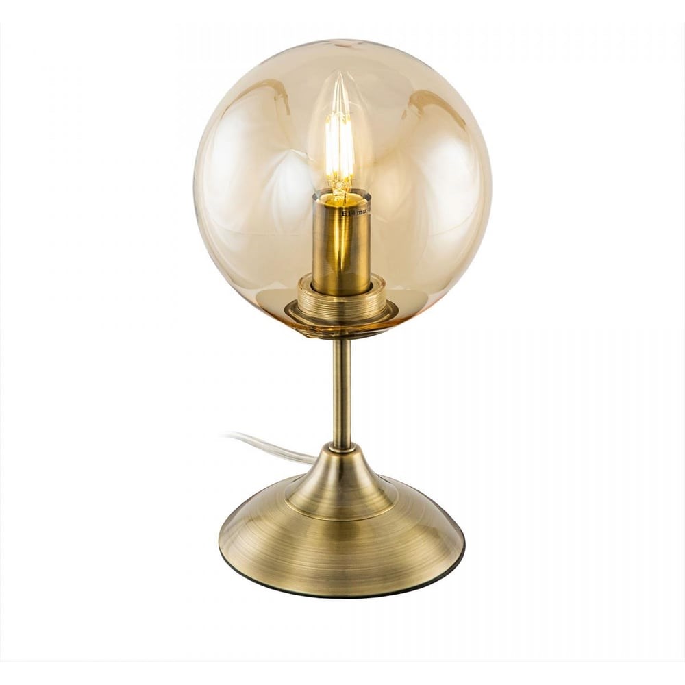 Настольная лампа CL102813 с одним плафоном. Корпус модели изготовлен из металла, цвет бронза. Плафон стеклянный в форме шара, прозрачный цвета шампань. Сетевой провод прозрачный длиной 1,7 метра, на нем расположен выключатель на расстоянии 20 см от основания. В этом настольном светильнике используется лампа в форме свечи с цоколем Е14, максимальная мощность лампы накаливания 40 Вт. Площадь освещения около 2,5 метров. Светодиодные лампы можно использовать большей мощности. Однорожковая настольная лампа Томми CL102813 отлично подойдет для помещений, оформленных в современном стиле.