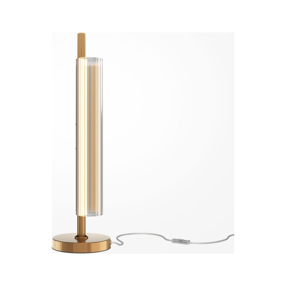 Длинные, изящные плафоны из рифленого стекла, словно танцуют в воздухе, образуя трендовый силуэт световых линий и погружая пространство в игру тени и света. Мягкий сатинированный финиш арматуры в цвете латуни придает шарм, подчеркивая утонченность и изысканность оформления.