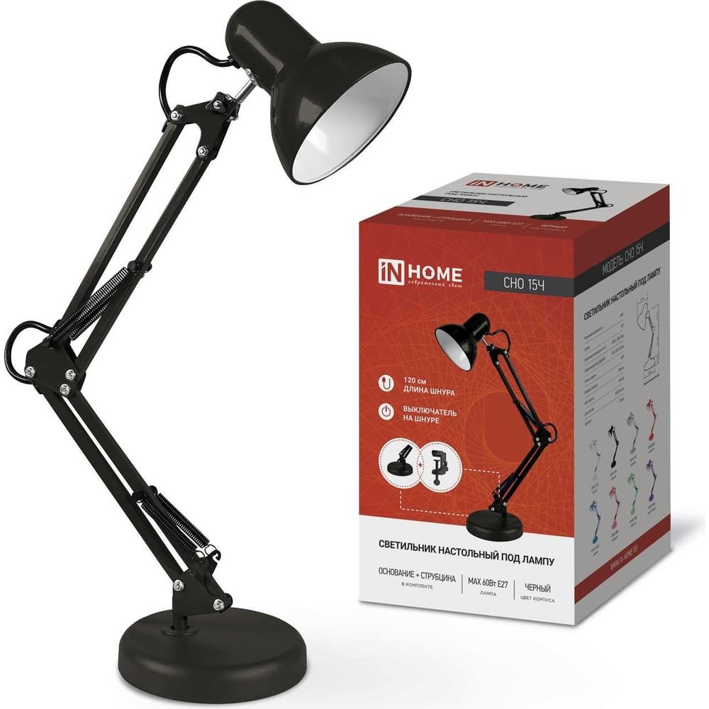 Настольный светильник под лампу IN HOME СНО-15Ч 60Вт E27 ЧЕРНЫЙ 4690612012902 обеспечит качественное локальное освещение рабочей зоны.Плоское основание придает светильнику устойчивое положение, а эргономичный плафон классической формы обеспечит идеальное рассеивание и защитит ваши глаза от яркого света.Большое разнообразие цветового исполнения корпусов позволит вписать светильник в любой интерьер.В качестве источника света используются лампы со стандартным цоколем Е27, мощность которых не должна превышать 60 Вт (лампа в комплект не входит).Светильник работает от сети 230В.