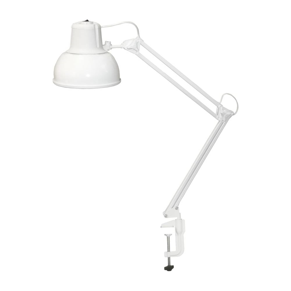 Светильник на Бета-К белого цвета на металлической струбцине, с цоколем Е27 (лампа в комплект не входит). Выключатель клавишный на плафоне. Подходит для использования в жилых помещениях и учебных заведениях, в офисах, а также в медицинских учреждениях, мастерских и пр. Подходит для интерьеров в стиле техно, лофт, минимализм и эклектика.