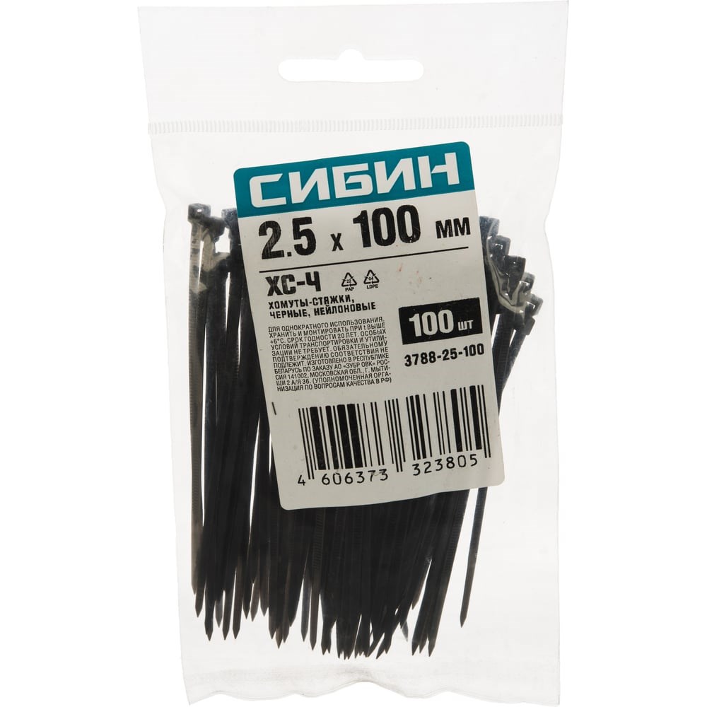 Хомуты-стяжки черные , 2.5 х 100 мм, 100 шт, нейлоновые, СИБИН ХС-Ч 3788-25-100 обеспечивают удобный и быстрый монтаж любых кабелей и проводов, а также широко используется в быту и строительстве. Хомуты-стяжки - оптимальное решение для быстрой связки и монтажа кабелей, проводов или других изделий. Изготовлены из прочного и эластичного нейлона.