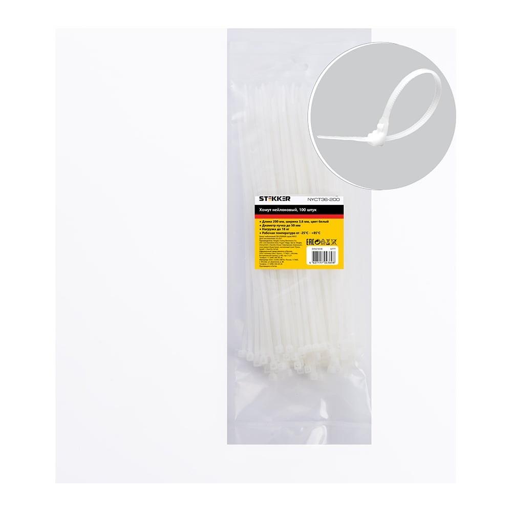 Хомут STEKKER NYCT36-200 нейлоновый 3.6x200 мм d пучка max 50 мм нагрузка 18 кг белый 32777
