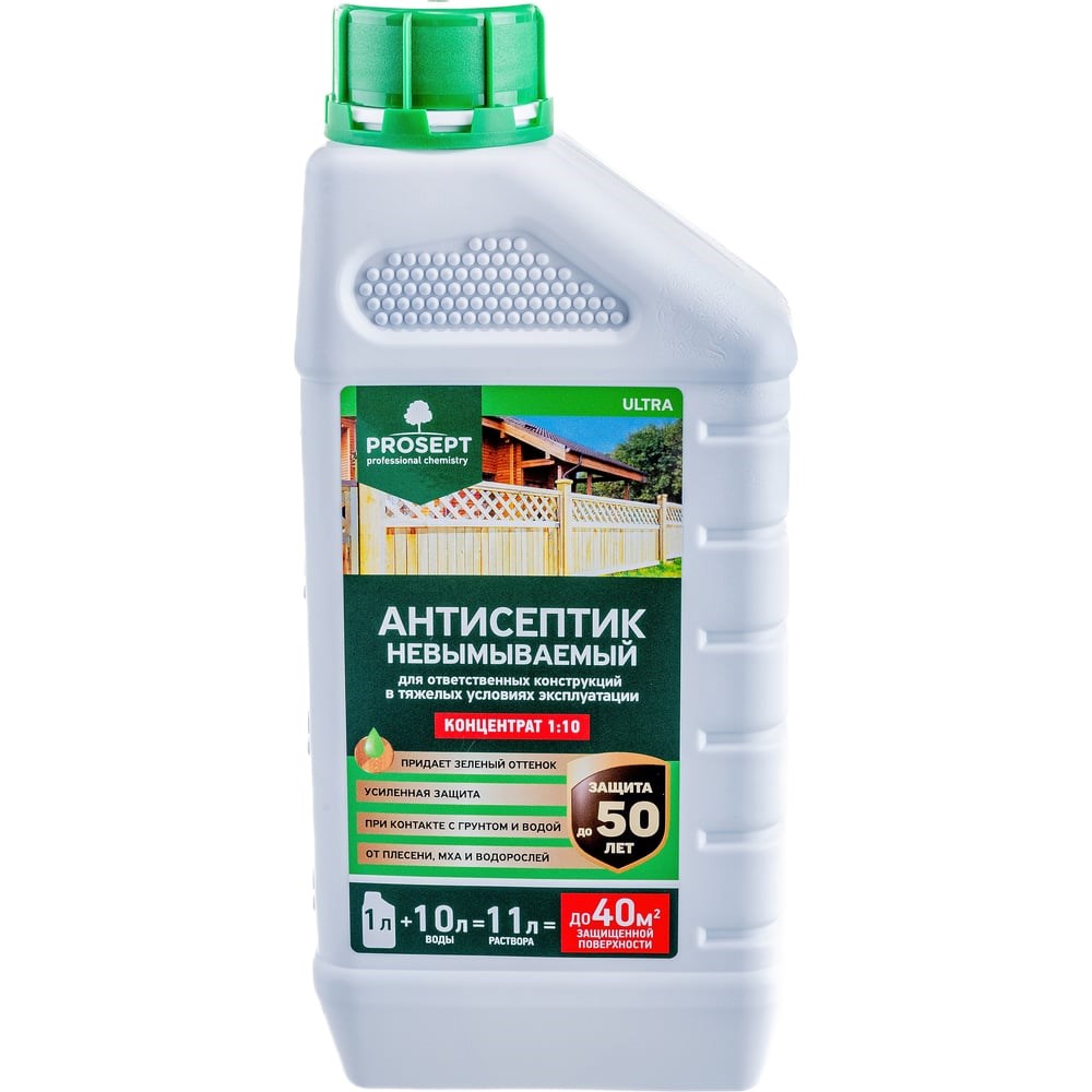 Невымываемый антисептик PROSEPT ULTRA для ответственных конструкций, концентрат 1:10, 1 л 008-1 предназначен для конструкций из древесины, эксплуатируемой в наиболее неблагоприятных условиях. Предназначается для усиленной защиты древесины различных пород в тяжелых условиях эксплуатации – при длительном контакте с грунтом и прямом воздействии атмосферных осадков.Сфера применения: конструкционные элементы каркасных домов, нижние венцы в домах из бревна или бруса, стропильная система кровли, перекрытия, террасы, заборы, элементы ландшафтного дизайна, садовая мебель, причалы, рудничные стойки, столбы и опоры ЛЭП и т.д.Обеспечивает защиту от домового грибка, гнили, плесени, насекомых-древоточцев на срок до 50 лет в зависимости от метода обработки и условий службы древесины.Состав глубоко пропитывает древесину, превращая ее в непригодную среду для жизнедеятельности микроорганизмов и насекомых. Древесина может склеиваться и окрашиваться.Цвет древесины после обработки антисептиком изменяется на светло-зеленый, спустя некоторое время переходит в медово-коричневый, а при эксплуатации без лакокрасочного покрытия выцветает впоследствии до серебристо-серого.Антисептик несовместим с составами на основе хрома.Расход рабочего раствора 150 - 350 г/м².Работы проводить при температуре не ниже +5 градусов. Нанесение раствора проводить с помощью кисти, валика с синтетическим ворсом или с помощью любого разбрызгивающего устройства, в 2-3 слоя, с промежуточными сушками по 20-30 минут.