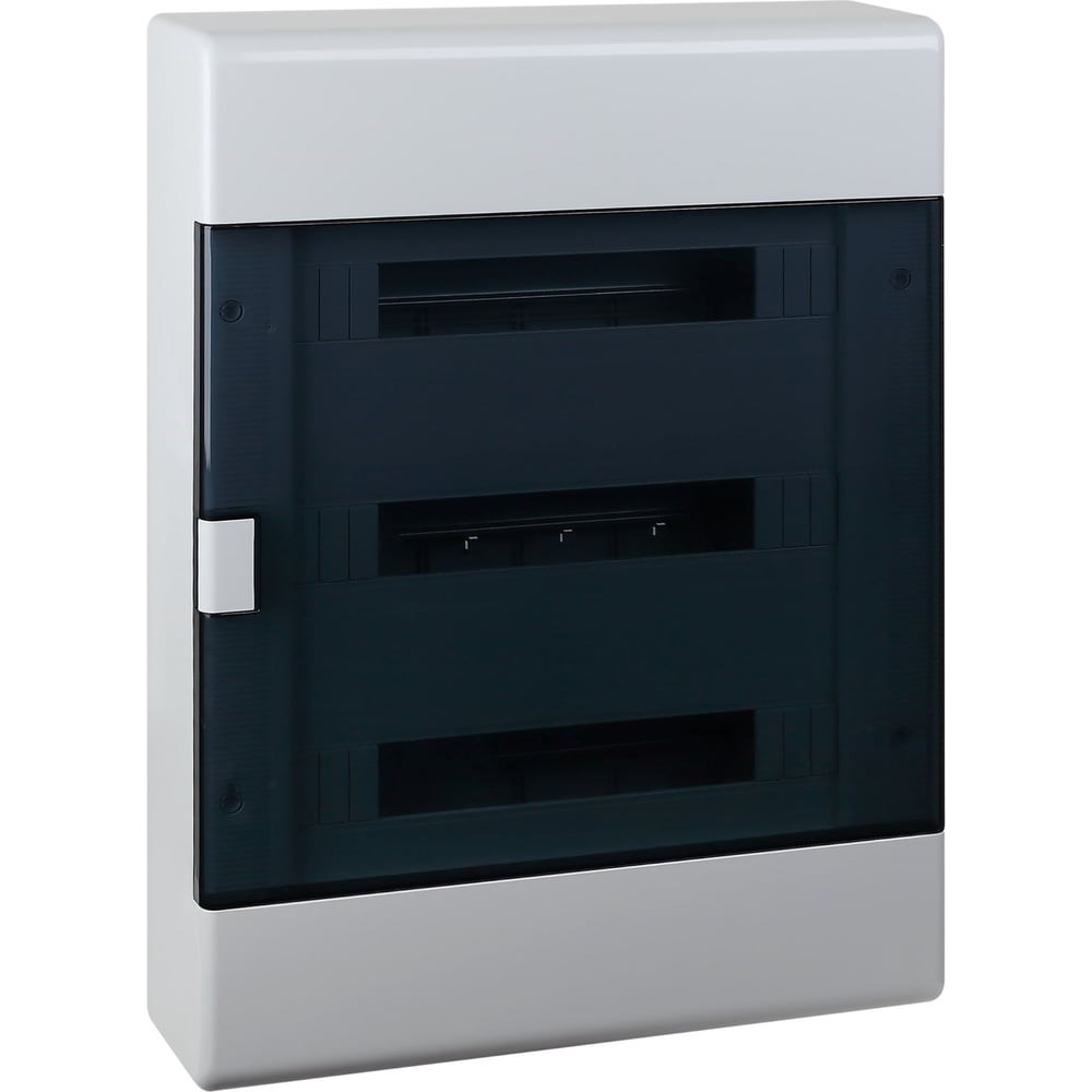 Щит «ТУСО» под автоматические выключатели для открытой проводки на 54 модуля (ЩРн-П IP41). Цвет серый, дверца тонированная. Предназначен для монтажа модульных компонентов и электрических счетчиков в жилых, производственных, складских, административных и торговых помещениях.Для удобства монтажа электротехнического оборудования рамка с DIN-рейками съемная. Стойки крепления для DIN-реек дают возможность монтажа модульного оборудования и приборов учета на разную глубину путем перемещения DIN-рейки в тот или иной паз.