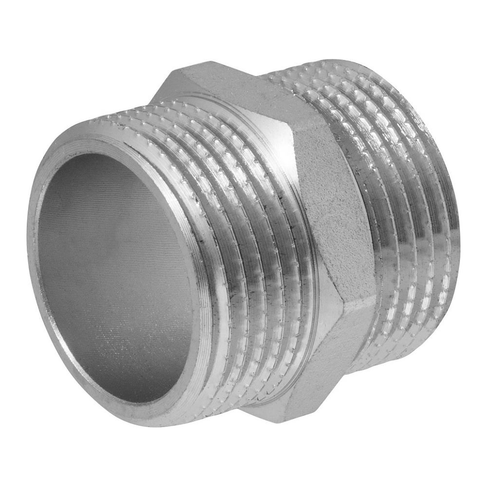 Ниппель сантехнический 1" н/н латунный MPF ИС.072166, также называемый бочонком 1", предназначен для соединения однородных элементов трубопроводов в системах холодного и горячего водоснабжения, а также отопления. Фитинг имеет форму цилиндра с наружной резьбой. Для обеспечения герметичного соединения при монтаже рекомендуется использовать сантехнический лен с пастой и/или тефлоновую ленту (лента ФУМ) и/или аэробный герметик.Ниппель 1" изготовлен методом горячей объемной штамповки (ГОШ). Изделие выполнено из высококачественной латуни CW617N и имеет никелированное покрытие толщиной не менее 7 мкм, что обеспечивает устойчивость к коррозии и допускает применение фитинга в системах питьевого водоснабжения благодаря пониженному содержанию свинца в сплаве. Для удобства монтажа каждый ниппель оснащен участком шестигранной формы под гаечный и/или разводной ключ.Соединение является разъемным, что облегчает обслуживание участка трубопровода и позволяет повторно использовать резьбовой фитинг. Вся линейка фитингов MPF прошла испытания в соответствии с ГОСТ Р 51372-99 «Методы ускоренных испытаний на долговечность и сохраняемость» в испытательной лаборатории ВНИИЦИ. По результатам испытаний подтвержден предполагаемый срок службы фитингов без проявления признаков коррозии не менее 25 лет.