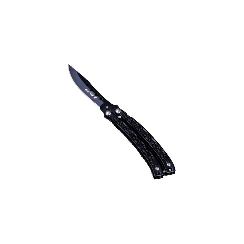 Нож-бабочка Мастер К лезвие с прямым обухом 7.5 см, рукоять с полукруглыми палочками 9 см 2301157 подходит для использования в туристических поездках, походах, на рыбалке и охоте. Лезвие изготовлено из прочной хромированной стали, что обеспечивает долгий срок службы. Безопасное хранение. Рукояти оснащены защелкой, которая предотвращает их случайное раскладывание.