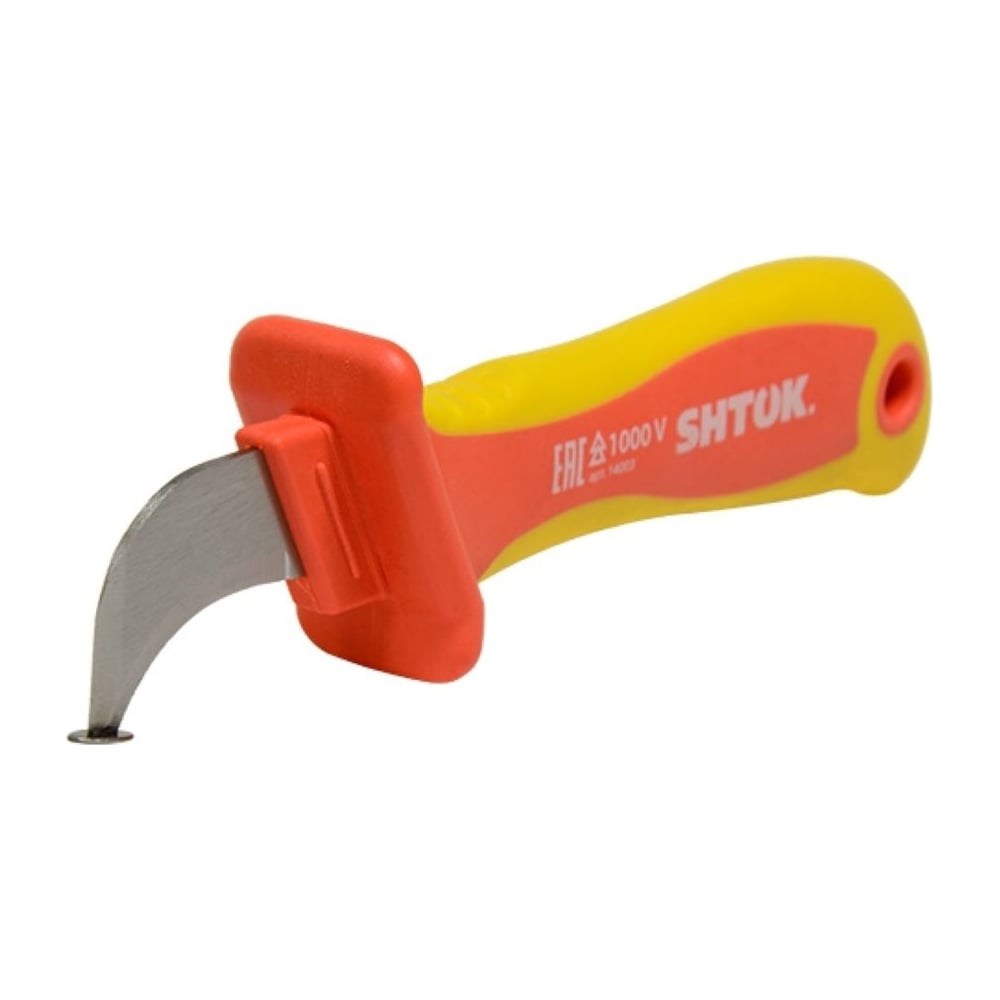 Нож для снятия изоляции с пяткой SHTOK 1000В VDE 14003 оснащен специальной рукояткой для надежного захвата. Можно применять данный нож для работ под напряжением. Инструмент не повреждает жилы во время снятия изоляции.