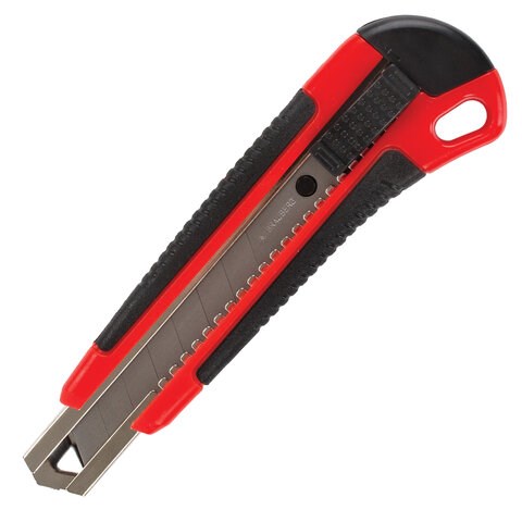 Легкий пластиковый корпус с металлическими направляющими надежно удерживает остро отточенное лезвие стандартной ширины 18 мм. По мере использования отработанные концы лезвия просто отламываются. В комплект входят 2 запасных лезвия, расположены в корпусе ножа. Дизайн корпуса эргономичный. Резиновые края ручки предотвращают скольжение пальцев, исключают их травмирование. Для удобства хранения имеется отверстие для подвеса. Яркий красный корпус выделяет инструмент среди других подобных, нож упакован в блистер с европодвесом.