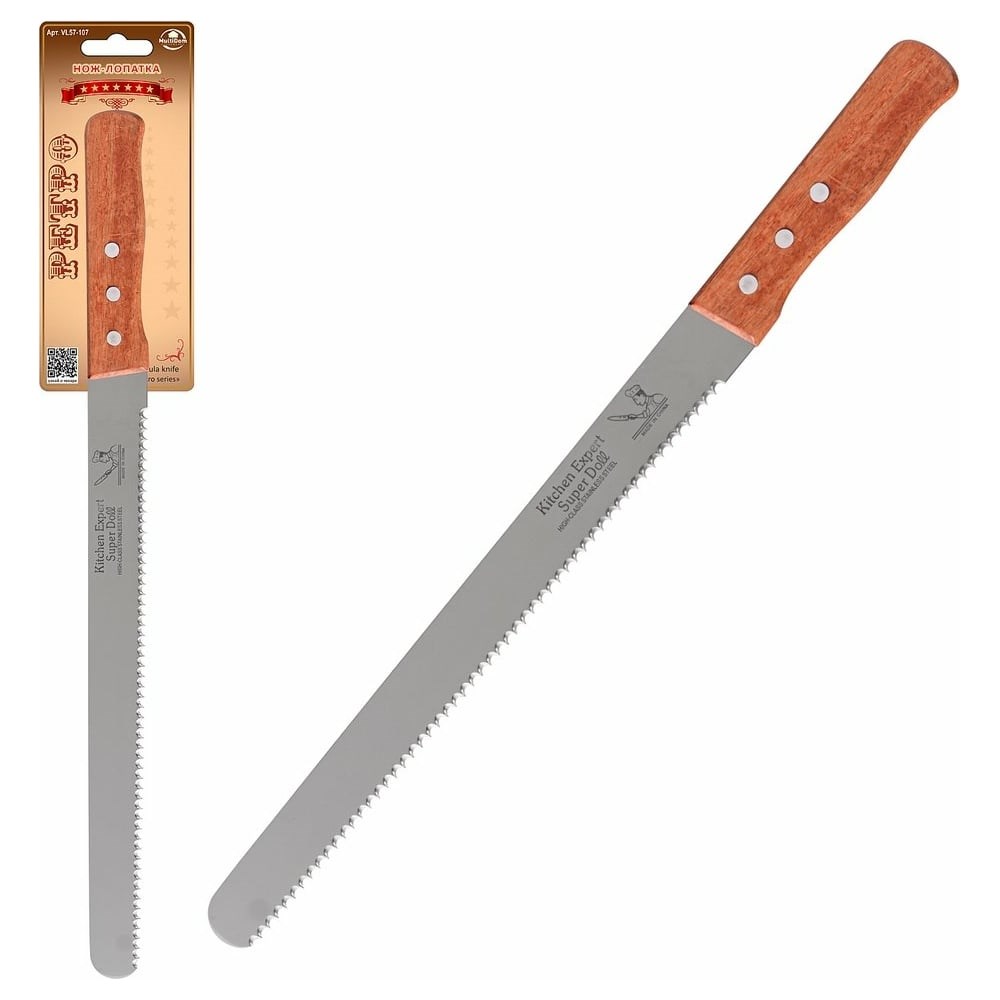 Нож-лопатка МУЛЬТИДОМ Ретро общая длина 42,5 см, длина рабочей части 29,5 см VL57-107 предназначен для бытового использования. Подходит для нарезания хлебобулочных изделий, выпечки, продуктов с твердой оболочкой и мягкой сердцевиной. Благодаря высокой прочности прослужит долгое время. За счет эргономичной формы нож удобно лежит в руке.