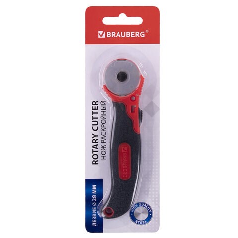 Нож раскройный роликовый 28 мм BRAUBERG, круглое лезвие, резиновые вставки, 238089