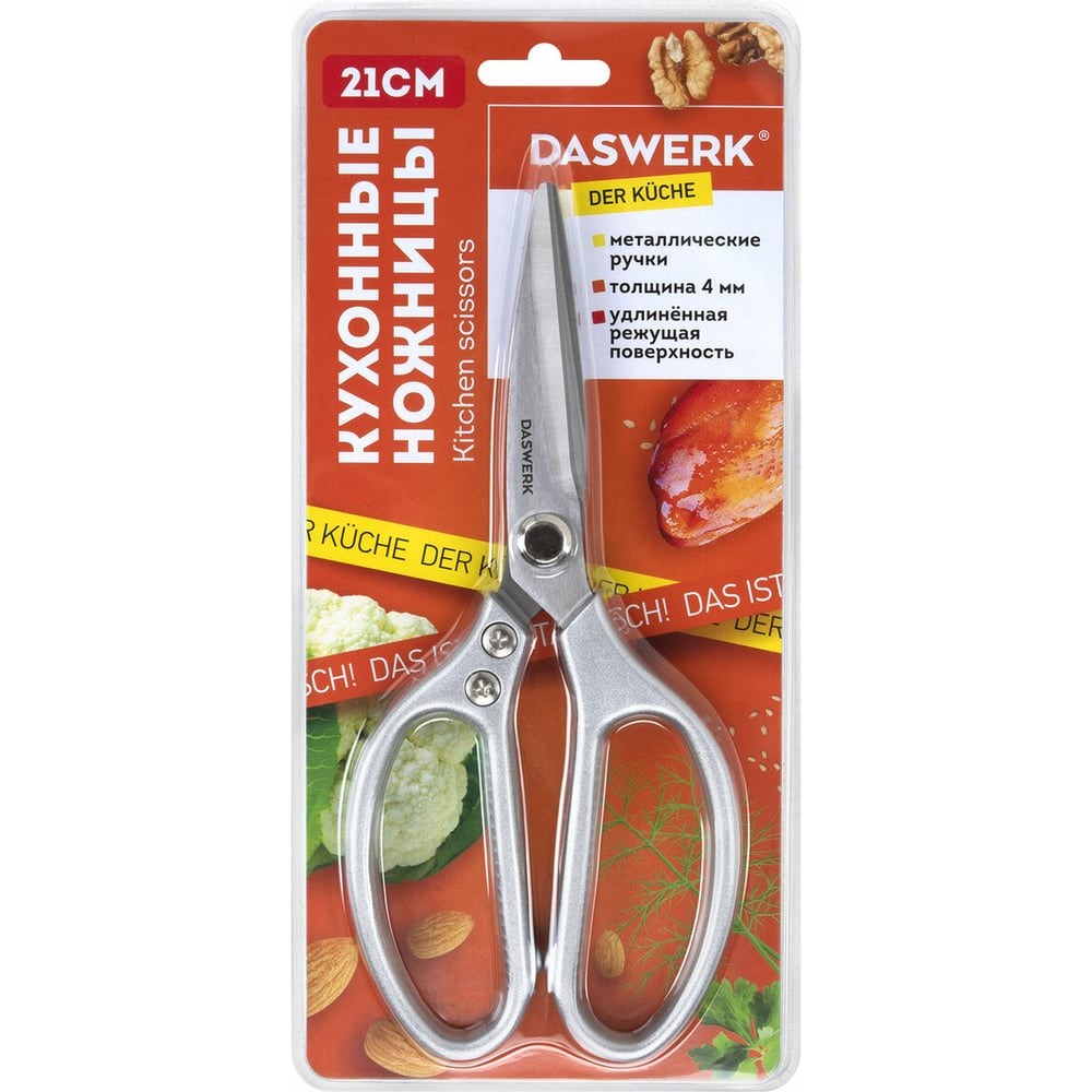 Кухонные ножницы DASWERK, длиной 210 мм, станут незаменимым помощником для вашего дома. Эти ножницы для кухни сочетают в себе максимальную функциональность и прочность, что делает их идеальными для любой посуды для дома.Прочные лезвия толщиной 4 мм выполнены из нержавеющей пищевой стали, что гарантирует долгий срок службы и точность реза.Эти кухонные принадлежности оснащены усиленной осью, исключающей зазор и люфт, а также эргономичными металлическими ручками с противоскользящим покрытием, обеспечивающими надежный захват и предотвращающими выскальзывание.DASWERK легко моются, не впитывают запахи и могут быть очищены в посудомоечной машине, что делает их идеальной посудой для кухни.Используйте ножницы для разделки рыбы, мяса птицы, нарезки овощей, зелени и пиццы, а также для резки бумаги, картона и текстильных материалов. Эти кухонные аксессуары также идеально подойдут для подрезки комнатных и садовых растений, делая их универсальной кухонной утварью для любого дома.