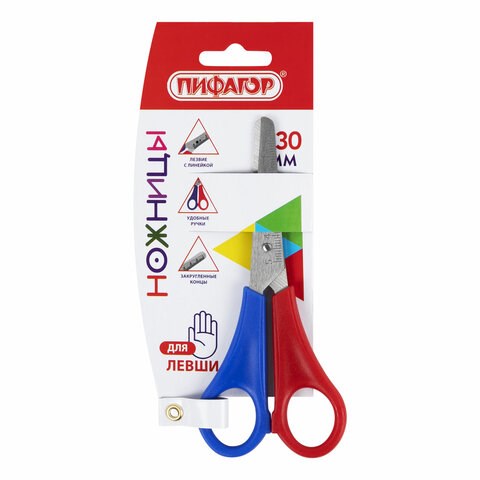 Ножницы ПИФАГОР разработаны специально для левшей. Ребенок без труда сможет ими воспользоваться, так как их длина всего 130 мм. Линейка на лезвии поможет ребенку в его творческом процессе, а закругленные концы сделают эти ножницы безопасными в использовании (при условии использования по назначению). Симметричные ручки из прочного качественного пластика и лезвия из нержавеющей стали обеспечивают ножницам максимально долгий срок службы. Продаются в картонной упаковке с европодвесом.