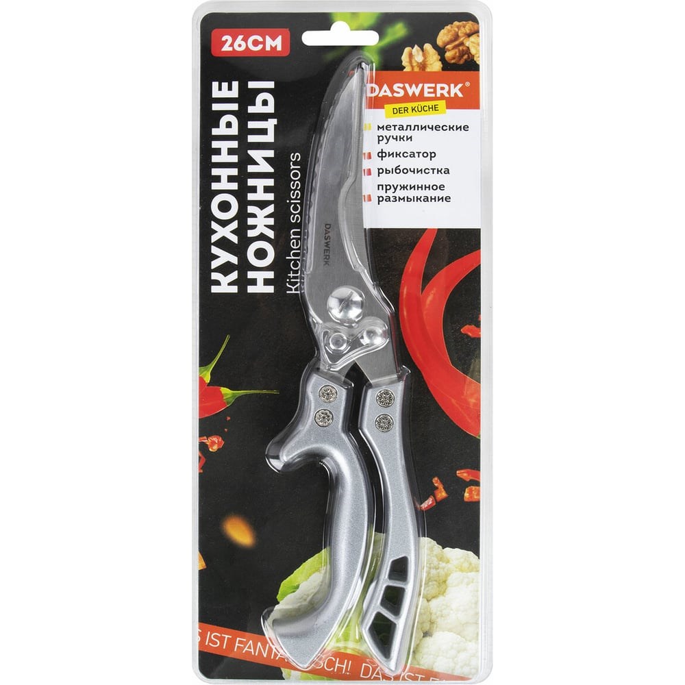 Ножницы-секатор кухонные DASWERK, 260 мм – это идеальное решение для тех, кто ценит функциональность и надежность на кухне. Эти кухонные ножницы из нержавеющей пищевой стали толщиной 4 мм обладают зазубренными лезвиями, позволяющими легко справиться с разделкой и чисткой рыбы, мяса птицы, нарезкой овощей и зелени.Благодаря усиленной оси и отсутствию люфта, вы получите точный и аккуратный рез.Эргономичные металлические ручки с противоскользящим покрытием обеспечивают надежный захват и предотвращают выскальзывание.Ножницы прекрасно моются, не впитывают запахи и могут безопасно использоваться в посудомоечной машине.Оснащенные фиксатором для безопасного хранения и зазубренным ребром для чистки рыбы, они станут незаменимыми кухонными принадлежностями в вашем доме. Эти ножницы справляются не только с кухонными задачами, но и подходят для резки проводов и подрезки растений, делая их универсальной кухонной утварью и полезным аксессуаром для кухни.Общая длина — 260 мм, что делает их удобными и практичными для повседневного использования. Ножницы-секатор DASWERK — это идеальная посуда для кухни и незаменимое дополнение к вашей кухонной утвари.