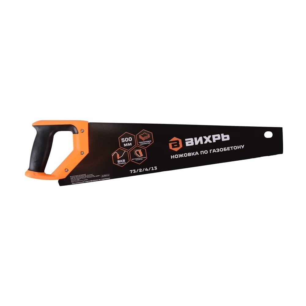 Ножовка по газобетону Вихрь 500 мм 73/2/4/13 представляет собой надежный инструмент для работы с газобетоном. Она оснащена широким полотном длиной 500 мм, что обеспечивает эффективное и точное резание. Полотно изготовлено из инструментальной стали, что гарантирует долговечность и устойчивость к износу. Двухкомпонентная рукоять обеспечивает удобный и надежный хват, снижая усталость при длительной работе.