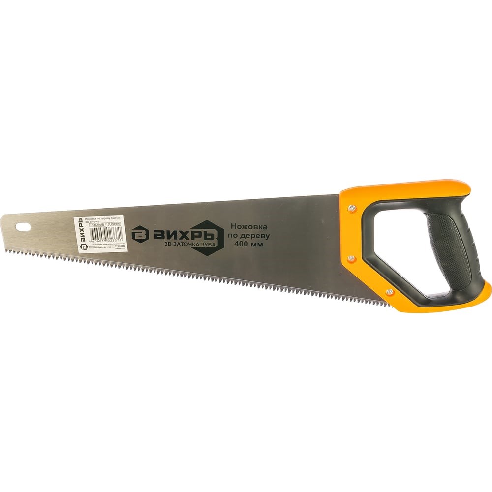 Ножовка ВИХРЬ 400 мм 3D заточка - это ручной инструмент для пиления древесины и других материалов. Длина ножовки 400 мм, шаг зуба 7-8 TPI. Ножовка изготовлена из углеродистой стали с твердостью закаленного зуба 46–52 HRС. Зубья имеют трехгранную (3D) заточку. Эта технология позволяет значительно увеличить скорость резки и уменьшить нагрузку на руки. Ножовка Вихрь оснащена эргономичной двухкомпонентной рукояткой, которая не натирает руки при длительной работе.   Ножовка ВИХРЬ 400 мм 3D заточка может использоваться для продольного и поперечного пиления древесины различной твердости и толщины. Подходит для использования в домашних условиях, на строительных площадках.