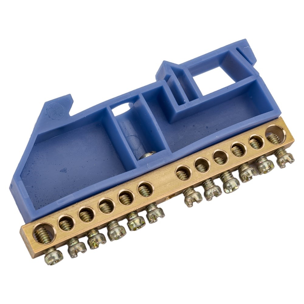 Нулевая N шина с синим изолятором на DIN-рейку REXANT 6x9 мм стойка большая 12 групп 11-2342 предназначена для электрического и механического соединения нулевых, защитных и фазных проводников. Выполнена из латунной шины, установленной на пластиковый изолятор, изготовленный из самозатухающего пластика. Номинальное напряжение: 450 В. Максимальное поперечное сечение проводника: 16 мм2. Температура эксплуатации: -40...+50 °C. Среднее значение относительной влажности эксплуатации не более 90%.
