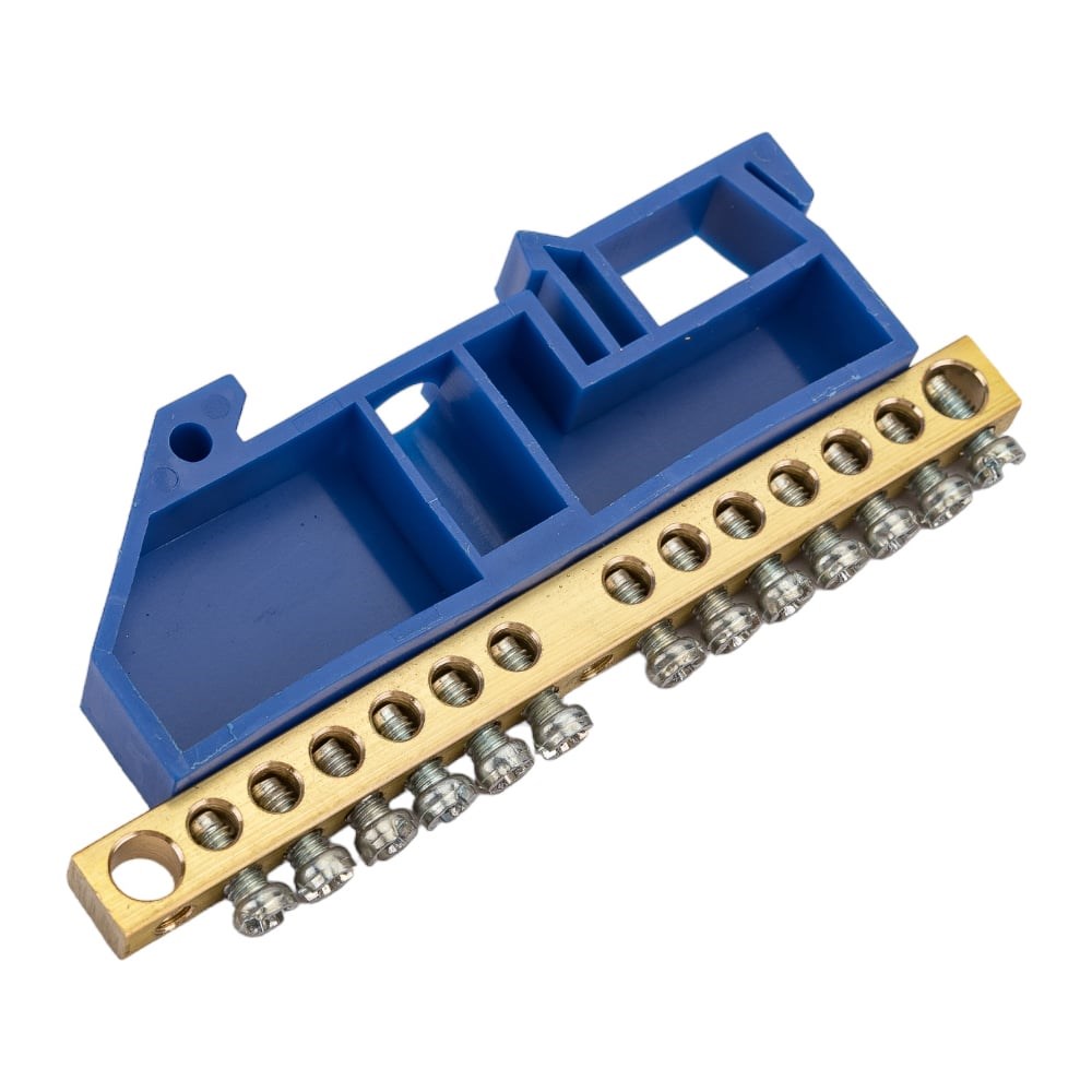 Нулевая N шина с синим изолятором на DIN-рейку REXANT 6x9 мм стойка большая 14 групп 11-2343 предназначена для электрического и механического соединения нулевых, защитных и фазных проводников. Выполнена из латунной шины, установленной на пластиковый изолятор, изготовленный из самозатухающего пластика. Номинальное напряжение: 450 В. Максимальное поперечное сечение проводника: 16 мм2. Температура эксплуатации: -40...+50 °C. Среднее значение относительной влажности эксплуатации не более 90%.