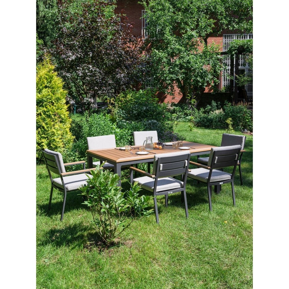 Комплект выполнен из прочного алюминиевого каркаса, который обеспечивает долговечность и надежность. Кресла обеденные оснащены планкой на спинке, к которой при помощи застежки-липучки прикрепляется подушка под спину светло серого цвета, что делает их еще более удобными и комфортными. Подлокотники выполнены из поливуда, что придает им особый шарм и элегантность. Большой обеденный стол имеет столешницу из поливуда, что придает ему не только красивый и элегантный вид, но и обеспечивает его долговечность и прочность. Этот обеденный комплект станет прекрасным дополнением к вашему саду или террасе, создавая атмосферу уюта и комфорта.