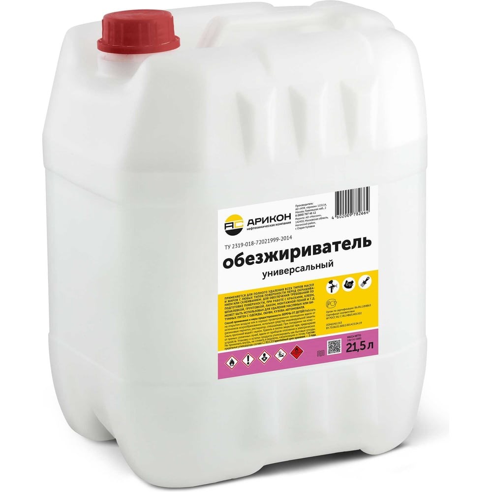 Обезжириватель АРИКОН канистра 21,5 л OBE21 применяется для очистки и обезжиривания поверхностей деталей на всех этапах кузовного ремонта. Пригоден для обезжиривания старых лакокрасочных покрытий, включая разные стали, оцинкованной стали, алюминия, загрунтованных и шпатлеванных поверхностей. Используется в ответственных процессах обезжиривания и мойки деталей, узлов и агрегатов перед закаливанием и нанесением гальванопокрытий, перед окраской любой поверхности, поскольку не оставляет при испарении пленки из нерастворимых компонентов (жиров, масел). Также используется для очистки тканей и кожи. С легкостью удаляет масляные, битумные, силиконовые, восковые загрязнения.