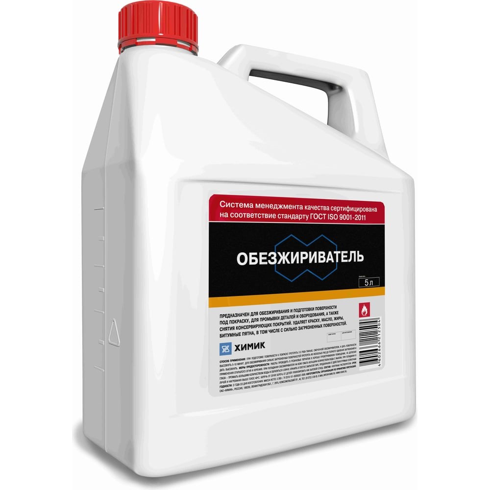Обезжириватель ХИМИК 5 л 66212504 предназначен для обезжиривания и подготовки поверхности под покраску, для промывки деталей и оборудования, а также снятия консервирующих покрытий. Состав удаляет масло, жиры, битумные пятна, в том числе с сильно загрязненных поверхностей.