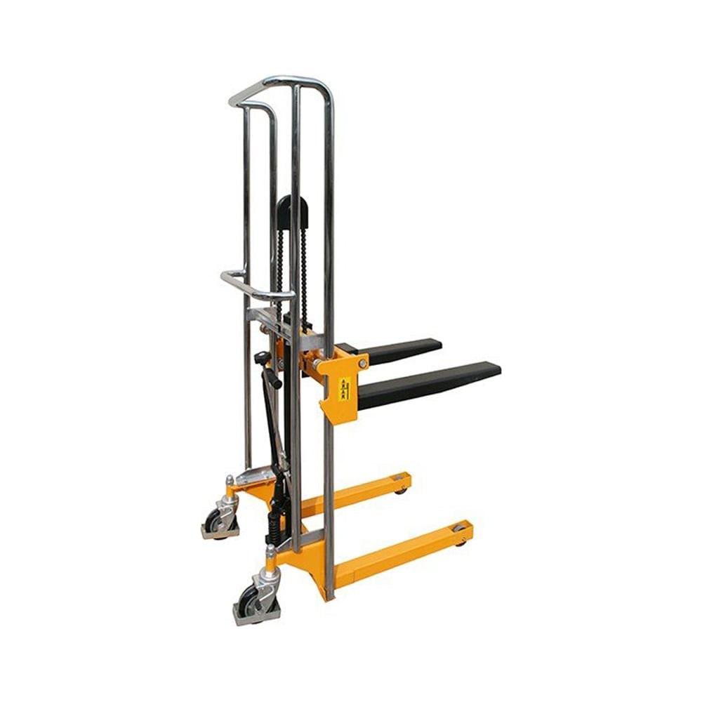 Гидравлический штабелер TOR 0,4 т, 1,5 м PJ4150 облегченный 1004905 имеет малый вес и способен поднимать грузы весом до 400 кг на высоту до 1.5 метра. Данная модель проста и удобна в использовании. Оптимальный размер колес обеспечивает плавное передвижение тележки по рабочей площадке. Эргономичная форма рукоятки удобна для захвата и комфортного управления. Дополнительные характеристики: Материал колес: полиуретан Размер платформы, мм: 650х550 Ширина вил, мм: 235-500 Скорость опускания (с грузом/без груза), мм/с: контролируемое ручное управление Ширина одной вилы, мм: 100 Дорожный просвет, мм: 28 Размер ведущих колес, мм: 125