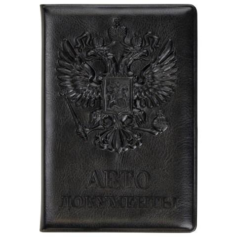 Модель выполнена из полиуретана, напоминающего кожу в черном цвете, украшена гербом Российской Федерации и тисненой надписью "АВТОДОКУМЕНТЫ". Имеет 6 пластиковых карманов и карман для водительских прав. Благодаря компактным размерам 95х130 мм удобно всегда носить с собой.