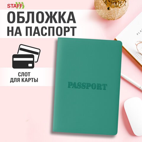 Обложка для паспорта, мягкий полиуретан, "PASSPORT", цвет "тиффани", STAFF, 238404