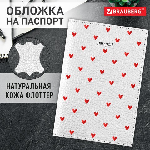 Обложка для паспорта натуральная кожа флоттер, принт "Сердечки", цвет белый, BRAUBERG, 238866
