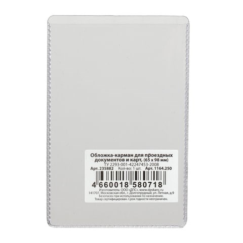 Обложка-карман для проездных документов, карт, пропусков, 98х65 мм, ПВХ, прозрачная, ДПС, 1164.250