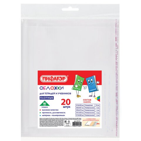 Обложки ПП для тетрадей и учебников, КЛЕЙКИЙ КРАЙ, НАБОР 20 шт., ПЛОТНЫЕ, 80 мкм, ПИФАГОР, 274118