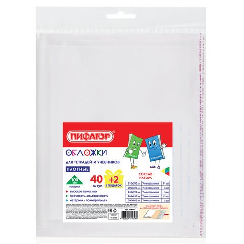 Обложки ПП для тетрадей и учебников, КЛЕЙКИЙ КРАЙ, НАБОР 40 + 2 шт. в ПОДАРОК, ПЛОТНЫЕ, 100 мкм, ПИФАГОР, 274117
