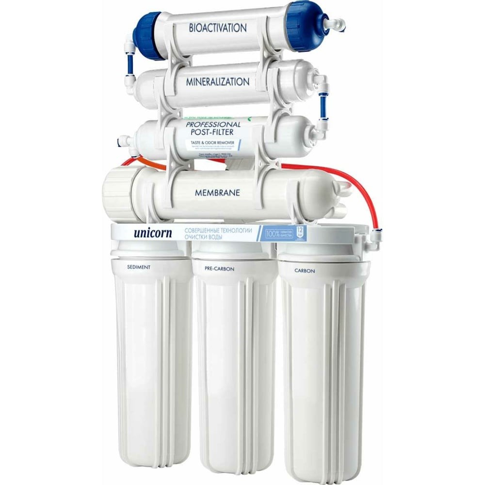 Обратноосмотическая система Unicorn FRO-7 541314 - система очистки для получения воды наивысшего качества. Несколько ступеней очистки, включая обратноосмотическую мембрану, позволяют удалить до 99% всех видов загрязнений, включая бактерии и вирусы. Очищенная вода накапливается в отдельном баке и подается через кран, отдельно устанавливаемый на кухонной мойке. 1 ступень очистки Механическая очистка. Устраняет нерастворенные в воде загрязнения механического типа, продлевая срок службы других картриджей. Ресурс - 12000 литров, срок службы - до 6 месяцев. 2 и 3 ступени очистки Угольная очистка. Устраняет хлор и другие органические загрязнения. Ресурс - 5000-8000 литров, срок службы - до 6 месяцев. 4 ступень очистки Обратноосмотическая мембрана. Устраняет до 96-99% загрязнений всех типов, в том числе бактерии и вирусы. Срок службы - до 3 лет. 5 ступень очистки Угольная очистка. Устраняет летучие субстанции и придает вкус натуральной родниковой воды. Ресурс - 6000 литров, срок службы - до 12 месяцев. 6 ступень очистки Биокерамическая активация воды. Активирует кластеры воды и делает ее биологически активной, восстанавливая природную структуру воды. Ресурс - 3600 литров, срок службы - до 12 месяцев. Главные свойства биоактивированной воды: удаление жиров, химических субстанций и токсинов из системы кровообращения; улучшение деятельности нервной системы; снижение уровня кислотности организма; повышение уровня кислорода; очищение организма. 7 ступень очистки Минерализация воды. Обогащает воду необходимыми человеческому организму минералами и микроэлементами. Ресурс- 3600 литров, срок службы - до 12 месяцев. Подготовленная таким образом вода хранится в накопительном баке, откуда поступает к отдельному крану на кухонной мойке. В комплект также входят отдельный кран на кухонную мойку и комплект картриджей.