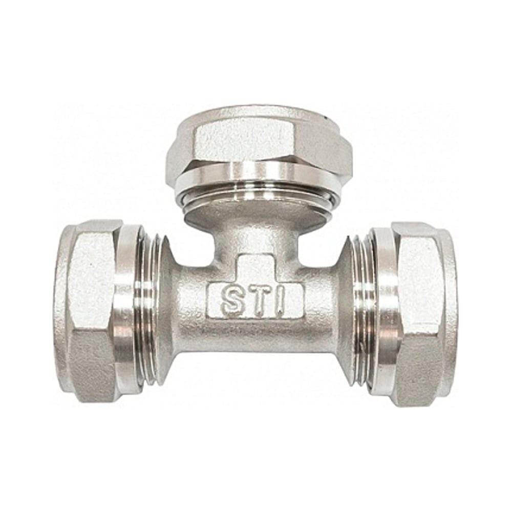 Тройник обжимной латунный Ду20 Ру25 STI D190-00032 предназначен для соединения элементов металлополимерных трубопроводов для внутренних систем отопления горячего и холодного водоснабжения, сжатого воздуха, транспортировки различных сред неагрессивных к материалам трубопровода, методом обжима. Изготавливается соединитель методом горячей штамповки и имеет никелированное покрытие. В проточках штуцера установлены два уплотнительных кольца из EPDM. Торец трубы контактирует с изоляционной прокладкой из PTFE (тефлон), которая предотвращает появление гальванической пары между алюминием трубы и латунью. Закрепление трубы на фитинге производится посредством обжимного кольца (сухаря), которое обжимает трубу в результате воздействия конусной части гайки на конусную часть обжимного кольца (сухаря). Номинальное давление: 2.5 мПа Рабочее давление: 1 мПа Максимальная температура рабочей среды: 115°C Максимально кратковременно допустимая температура рабочей среды: 130°C Рабочая температура при давлении 1 мПа: 0-95°C Рабочая температура при давлении 2.5 мПа: 0-25°C Тип резьбы: трубная цилиндрическая по ГОСТ6357-81