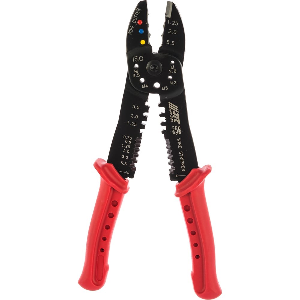 Обжимные клещи 5 в 1 JTC 5209 - это универсальный инструмент, который позволяет выполнить целый ряд функций: "перекусить" провод или винт, обжать и опрессовать клеммы, а также снять изоляцию с провода. Данная модель изготовлена из среднеуглеродистой стали высокой прочности (HRC 48~53 градусов).
