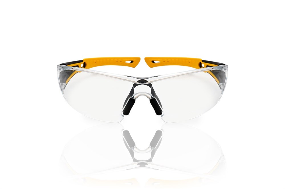Защитные очки последнего поколения с двухцветными мягкими дужками, сделанными с применением инновационного материала ТЭП (термоэластопласт), с панорамными линзами, которые обеспечивают улучшенный обзор и защищают глаза от попадания летящих частиц.