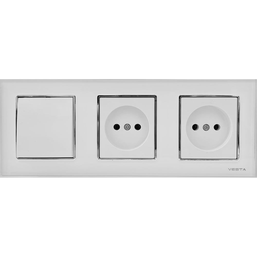1-клавишный выключатель + розетки без заземления Metronex Electric Комплект-3, Эксклюзивный Белый FRM050305BEL в рамке из закаленного стекла прозрачно-белого цвета. Механизмы можно вынуть из рамки и поменять порядок как самих розеток и выключателей, так и изменить их на горизонтальное, либо вертикальное расположение. Контакты механизмов изготовлены из чистой меди с серебряным покрытием, что гарантированно защищает от залипания и образования дуги, а в сочетании с абсолютно негорючим, термостойким пластиком последнего поколения, защитит дом от одной из частых причин возгорания в бытовых помещениях. Для установки блока необходимо 3 стандартных круглых подрозетника.